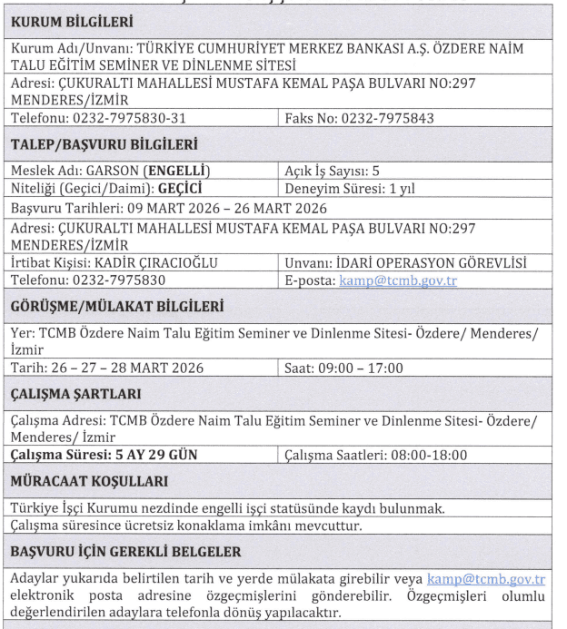 Merkez Bankası tarafından yayınlanan ilana göre, KPSS şartı olmadan 170 işçi alımı yapıyor. Yapılacak olan bu işçi alımı Merkez Bankası’nın Özdere Naim Talu Eğitim seminer ve Dinlenme Sitesi’nde istihdam edilecek.